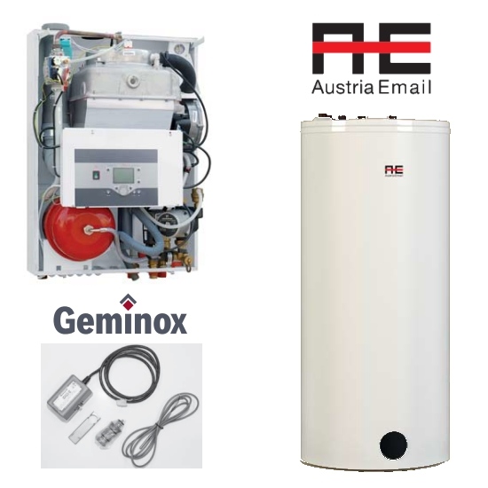Kotel Geminox THRs 1-10 C (neuvěřitelný rozsah výkonu 0,9 až 9,5 kW ) v setu se zásobníkem teplé vody AUSTRIA EMAIL 111 litrů je obvykle používán v nízkoenergetických domech a je velmi často aplikován v kombinaci s alternativními zdroji energie (solární vytápění, tepelná čerpadla atp). Je držitelem světového primátu v modulaci výkonu 10 – 100 %. Splňuje požadavky na vytápění přímého topného okruhu ( radiátory nebo častějí podlahové vytápění). Je určen k vytápění objektů s velmi malou tepelnou ztrátou do 10 kW.Kotel má velikost (540x760x361 mm) .